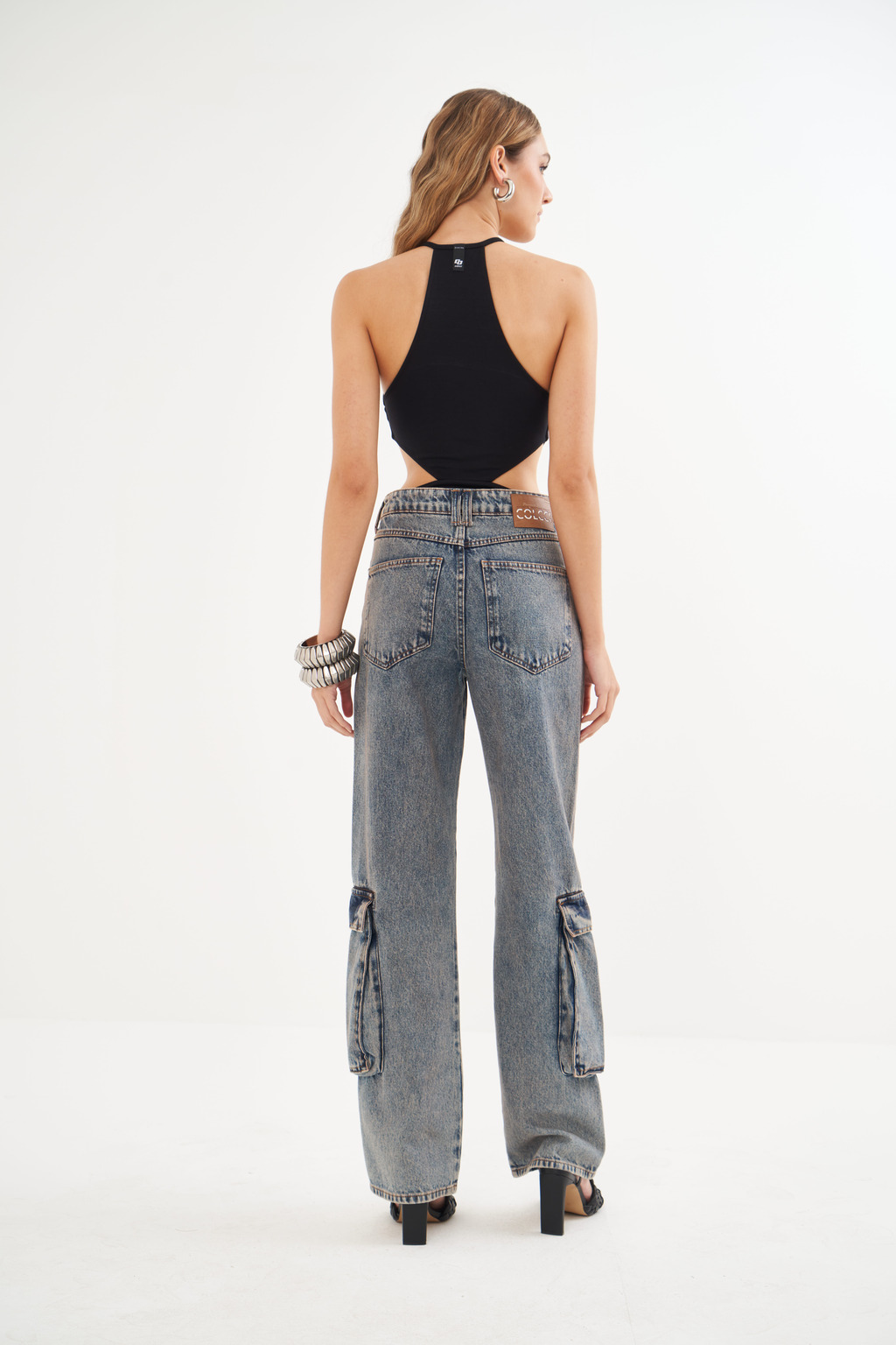 Para um contraste hi-lo super moderno, combine o body com nossa calça jeans cargo de lavagem vintage, como na foto. A união do utilitário com o sensual cria um look autêntico e cheio de atitude. Para uma produção noturna sofisticada, aposte em uma calça de alfaiataria ou uma saia de chiffon fluida para brincar com texturas e movimentos.