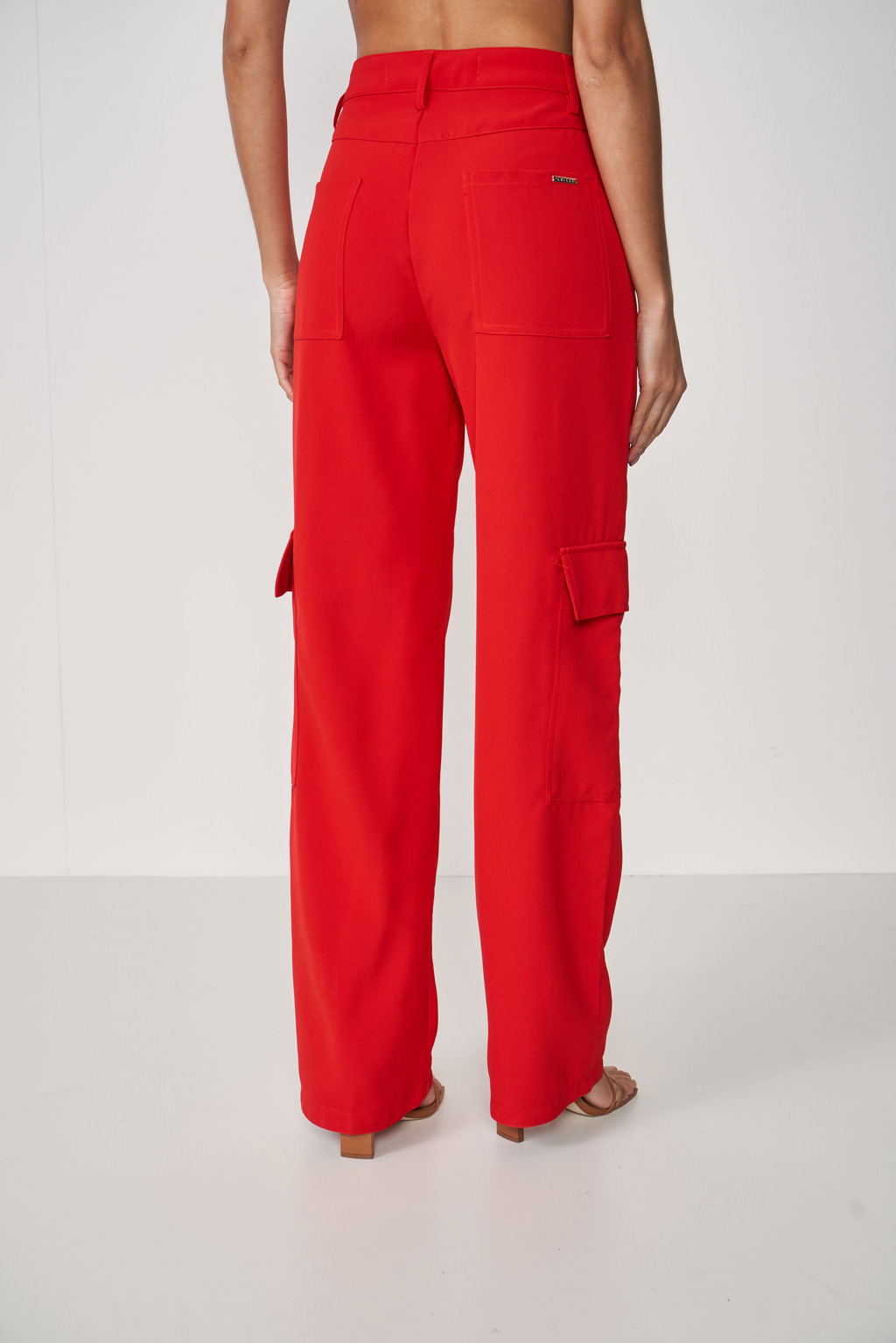 Calça: Modelagem reta, cintura alta, comprimento longo, bolsos cargo funcionais nas laterais, fechamento por zíper e botão.