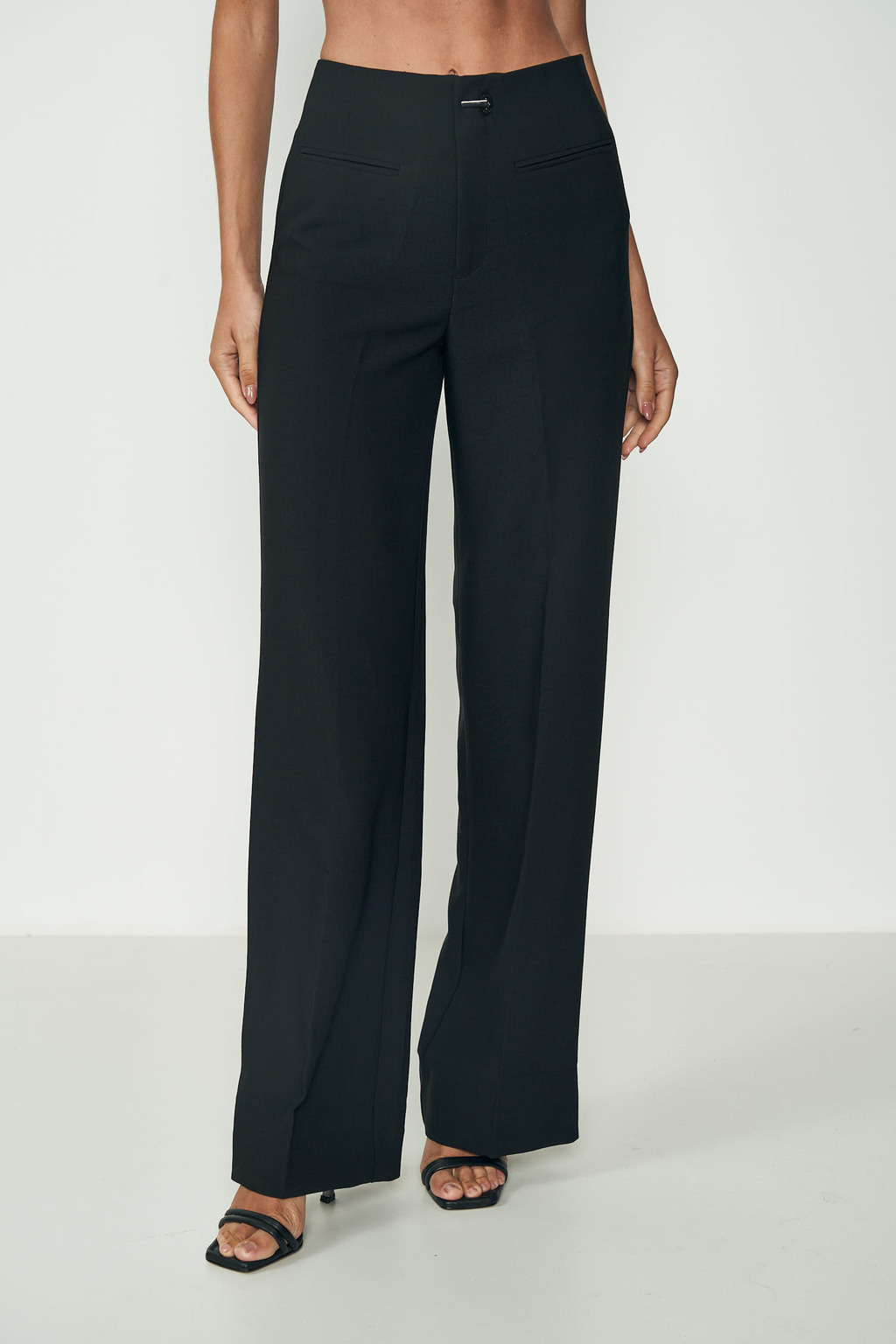 Calça: Modelagem ampla, cintura alta, comprimento longo, bolsos frontais, fechamento em zíper e botão.