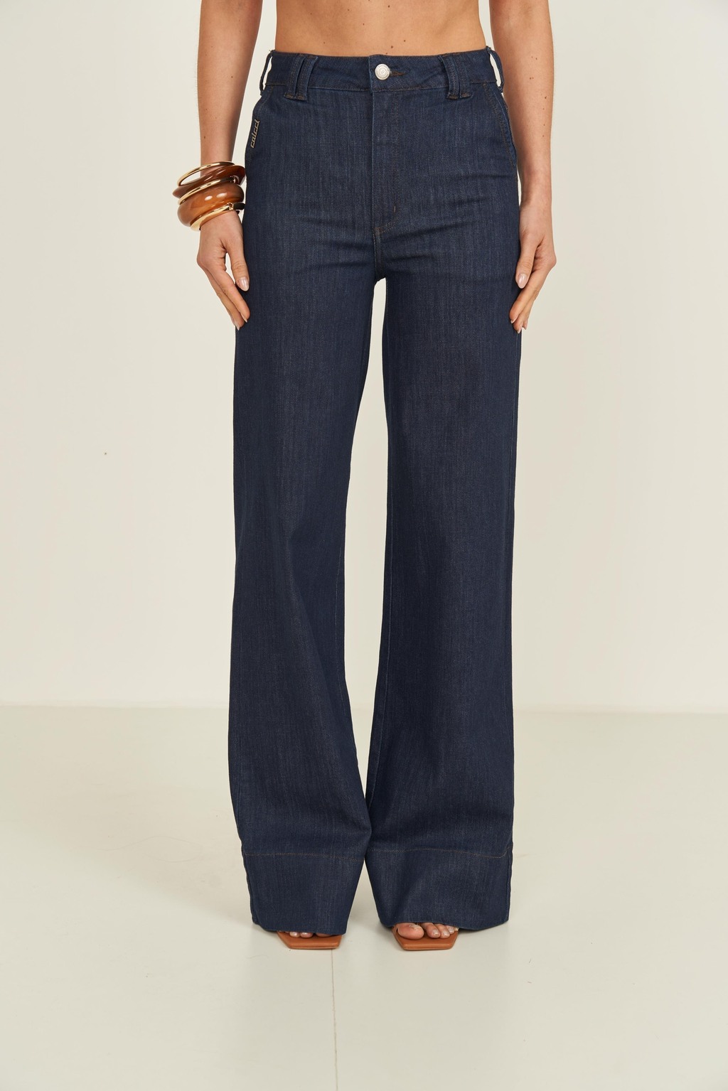 Peça: Calça Jeans Juliette Stretch. Cor: Azul Denim Escuro (lavagem clássica e profunda). Tecido: Corpo: 91% Algodão, 7% Elastolmultiéster, 2% Elastano, proporcionando um toque macio, durabilidade e a flexibilidade ideal para o conforto. Forro: 52% Poliéster e 48% Algodão, para um acabamento interno suave. Design: Modelagem Wide Leg (pernas amplas) com cintura alta, que alonga a silhueta e oferece um caimento elegante. Possui cós com passantes para cinto, fechamento frontal em zíper e botão, e bolsos frontais e traseiros funcionais. A barra é larga e o denim tem um toque mais leve, ideal para o calor. Detalhes: Etiqueta de couro com o logo COLCCI na parte traseira do cós, um selo de autenticidade e qualidade. As costuras aparente reforçam o design. Funcionalidade: Confortável e flexível, é ideal para o calor, oferecendo liberdade de movimento e um visual estiloso e sofisticado para diversas ocasiões do verão.