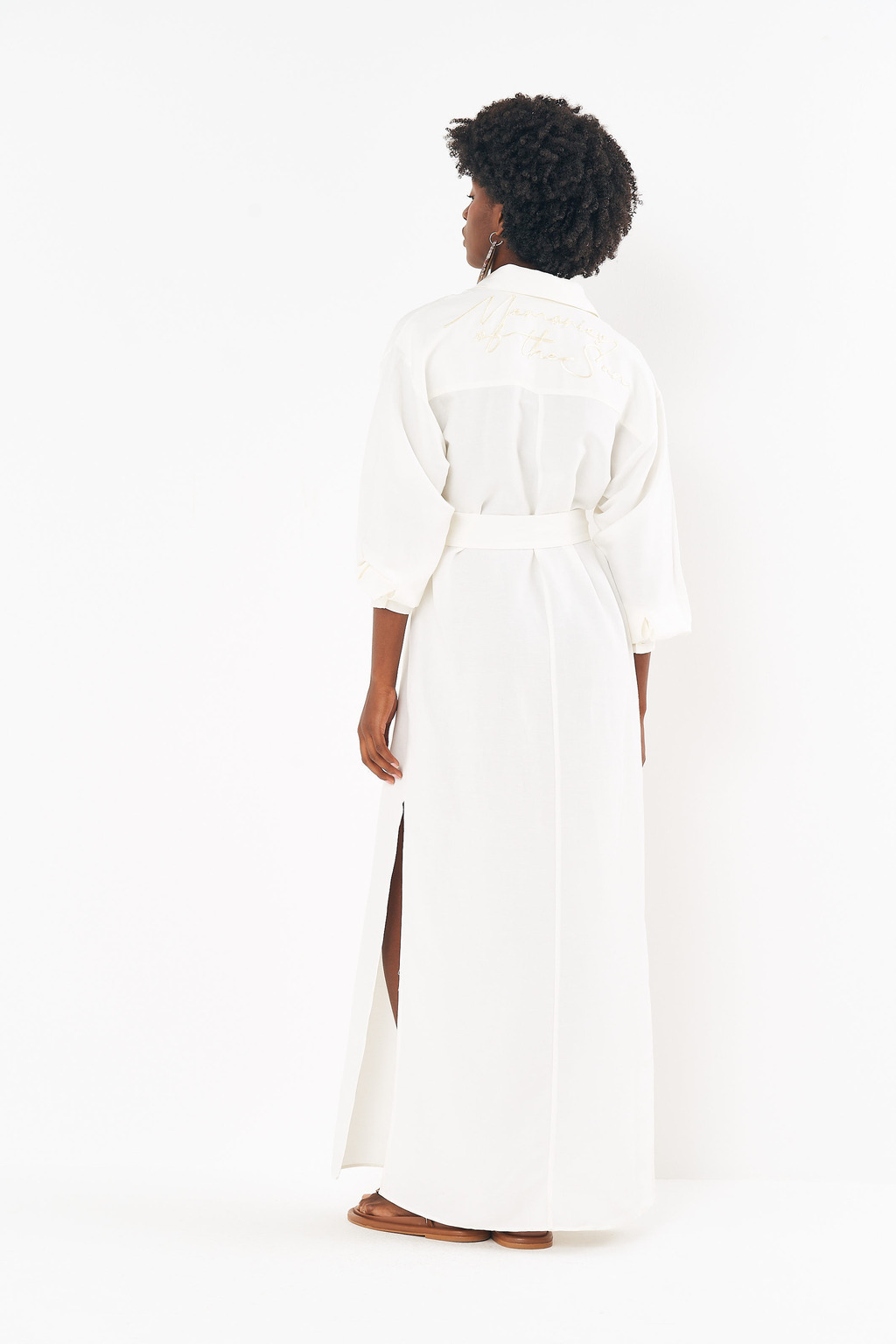 A sofisticação que abraça o corpo. Este chemisier da coleção Riviera é a definição de elegância contemporânea, combinando a leveza do linho com detalhes que capturam o espírito da estação. O corte fluido, a amarração que ajusta a silhueta e o recortes estratégicos nas costas (visíveis na imagem de detalhe) trazem um toque de modernidade e sensualidade sutil. A mensagem bordada nas costas 'Memories of the Sun' completa a narrativa, convidando a viver a primavera com leveza e estilo.
