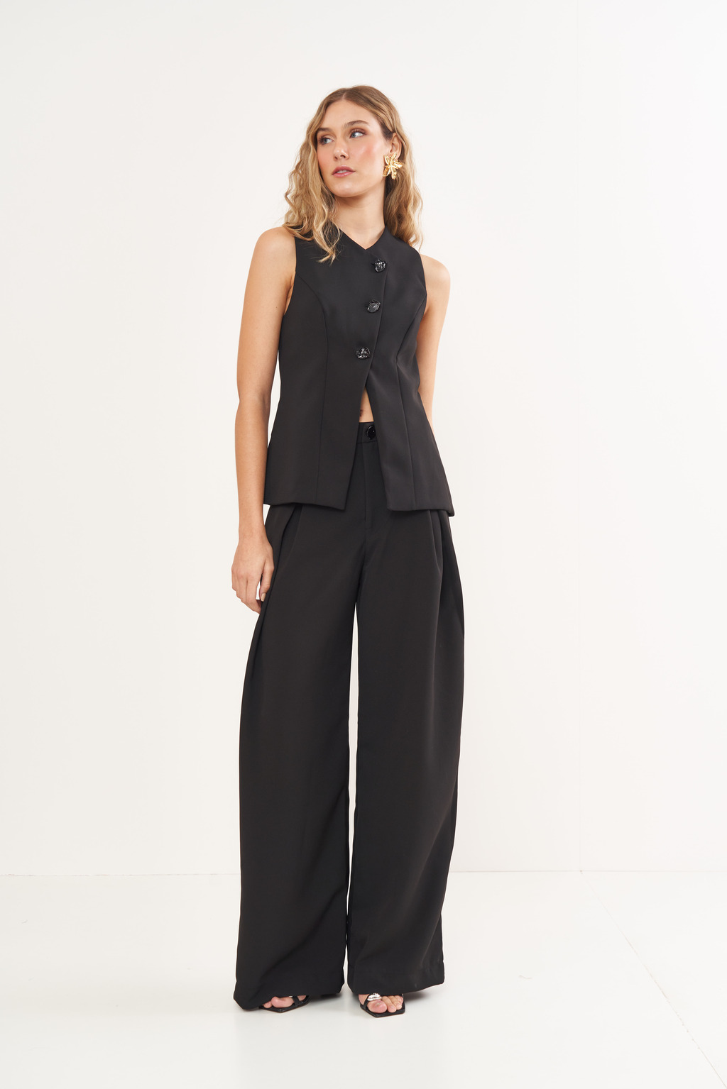 Design: Modelagem reta e ajustada, sem mangas. O design remete a um colete clássico de alfaiataria, com decote em V e um moderno fechamento frontal com botões dispostos de forma assimétrica.