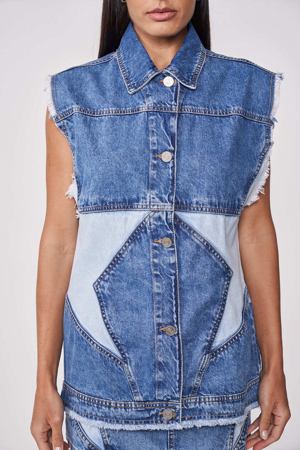 Colete Double Star Alongado: Modelagem alongada, sem mangas, fechamento frontal com botões, com bolso frontal e nas costas, detalhe de duas estrelas.